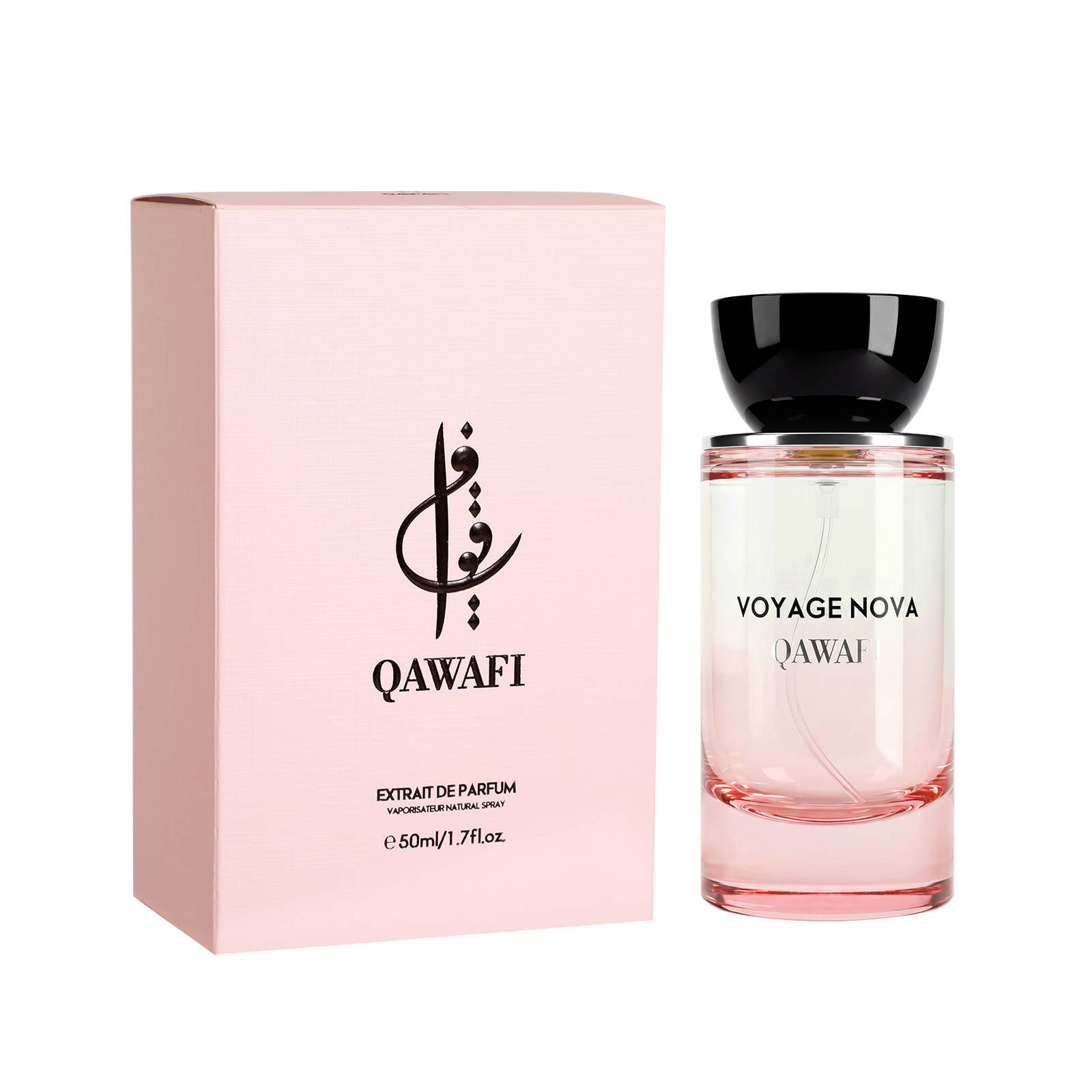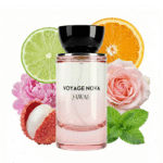 “Voyage Nova” ignites with litchi glow, bergamot and ginger sharp and slow—top notes luminous, bold, and delicately bold. Peony and Turkish rose unfold soft, cacao weaving warmth untold, a heart romantic, rich, and gold. Patchouli grounds the scent profound, base notes deep, luxurious, and bold. A fragrance that dreams, unforgettable and whole.